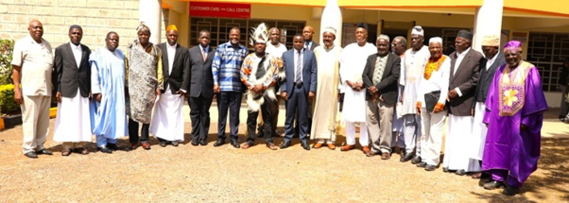 The Governor of Kakamega County- H.E. Hon. FCPA Fernandes Barasa (at the center with traditional attire), the Vice Chancellor, Prof. Solomon Shibairo (sixth from left) together with the Community leaders.