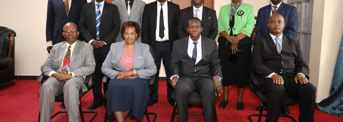 DVC-PRI Prof. Charles Mutai (far right), Chairperson, Deans Electoral Board- Prof. Josephine Ngaira, DVC ASA- Prof. Hussein Golicha together with the newly elected Deans.